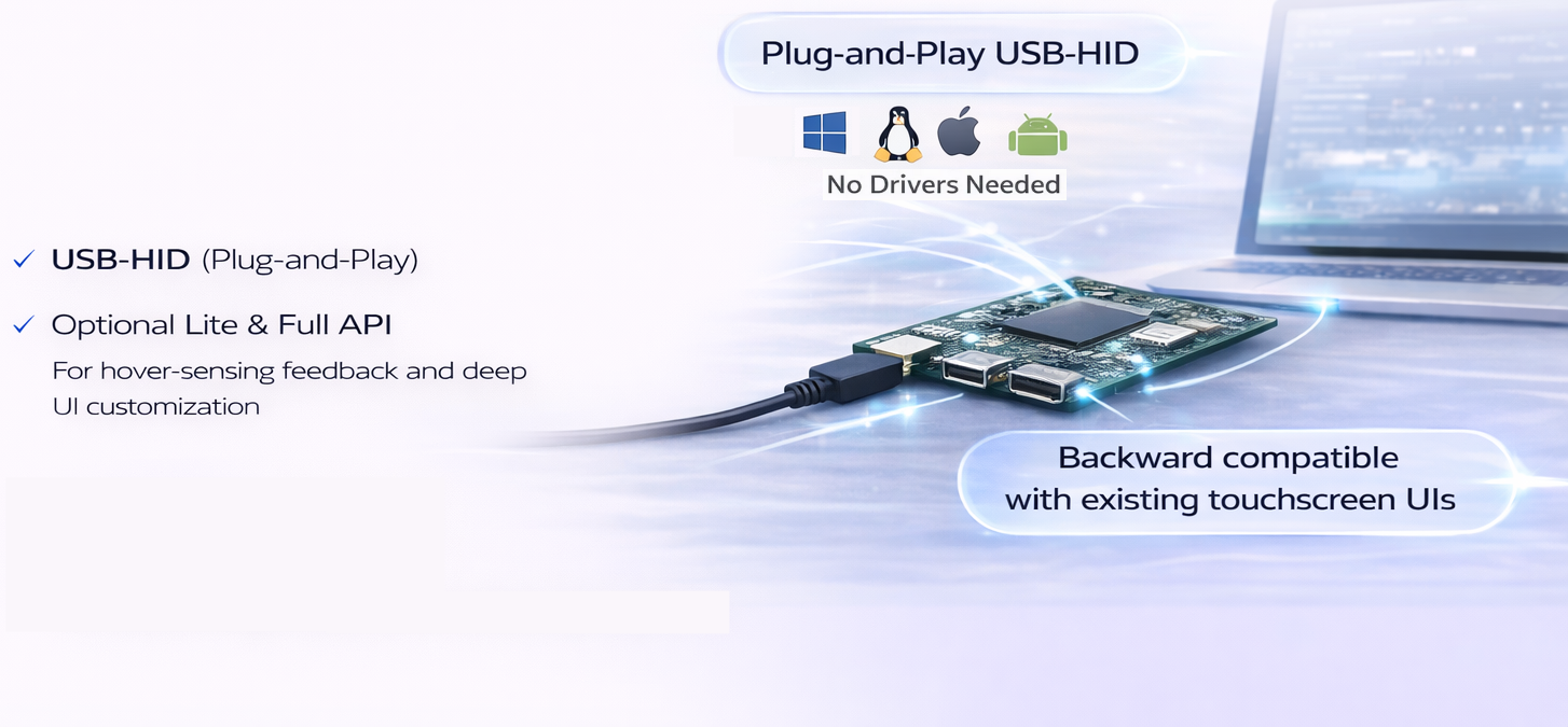 Electric-field sensing, empowered with the use of AI & ML algorithms, can accurately detect the position of a user’s finger over a surface by detecting changes in electrical capacitance. This allows our products to interpret intuitive and practical touchless gestures such as tapping and swiping all without physical contact.